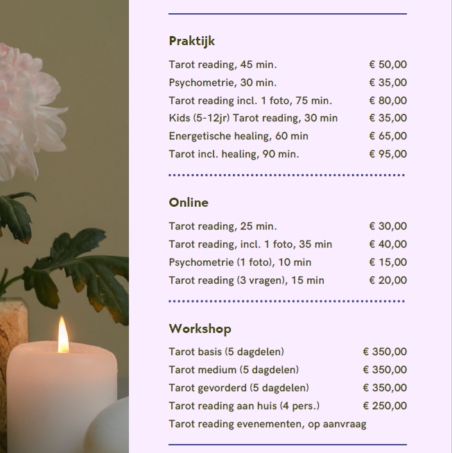 Je bent van harte welkom om een sessie te boeken op een manier die bij jou past. Of je nu kiest voor een tarot reading, een energetische healing, een intuïtieve afstemming of een combinatie daarvan: we nemen rustig de tijd en stemmen samen af op jouw vraag en energie van dit moment.