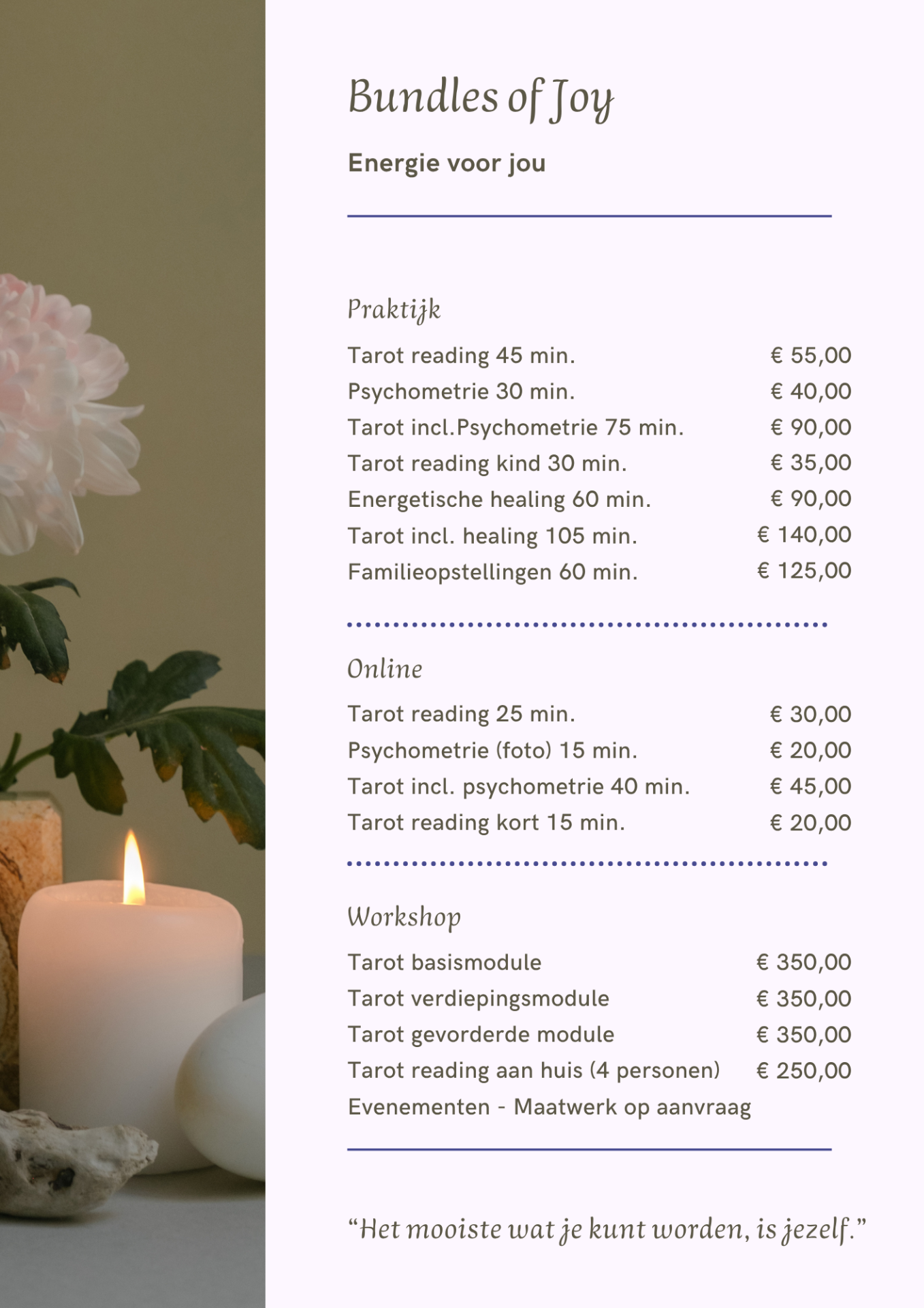 Alle behandelingen zijn uitsluitend op afspraak.